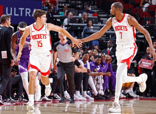 要知道这场比赛杜兰特开场一度是4中1,最终是10中7,这位37岁的老将依旧是联盟最顶级的得分手,真实命中率高达82%,正负值+5,杜兰特这个首秀我觉得至少可以打90分。火箭一直在与KD谈提前续约,看到杜兰特这样的竞技状态后一切都是顺理成章的。